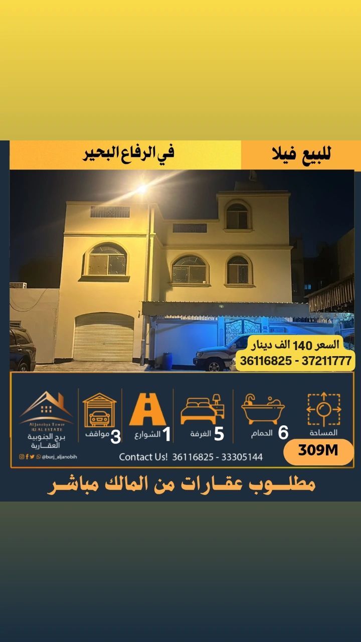 For sale: a house in Riffa Al-Bahir. Note: only for original Bahrainis. 5 bedrooms, 6 bathrooms, two halls, a large kitchen, front and back doors, a garage for 3 cars, a courtyard. Area: 309 square meters. Price: 140,000 BHD, negotiable for serious buyers.