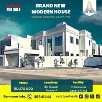 A luxurious villa for sale in Bu Quwa (Saraya - 2) for 270,000 Bahraini dinars. Prime location on two streets and a corner. Land area: 376.7 square meters. Building area: approximately 450 square meters. Villa features: 3 master bedrooms (with possibility to add two more bedrooms), 5 bathrooms, 3 open living rooms, central air conditioning, spacious kitchen, maid's room with bathroom, laundry room, storage room, garden, garage for two cars, equipped with surveillance cameras and fittings for elevator installation, balcony.
