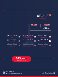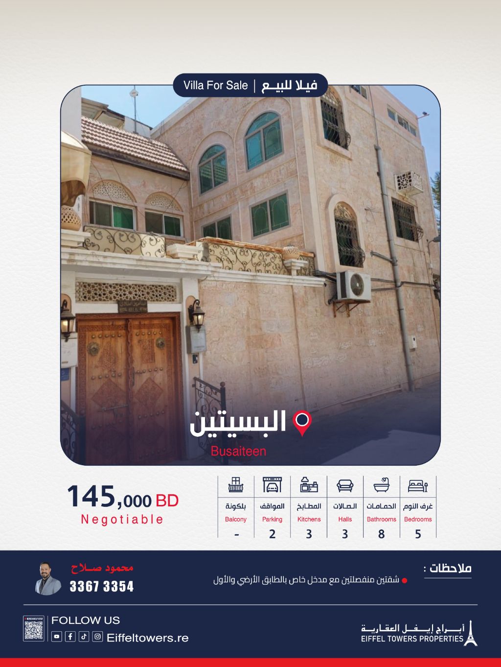 Eiffel Towers Real Estate Company for sale: A house in Al-Busaiteen plus two apartments with a separate entrance. House specifications: Land area 338 square meters. Ground floor data: Room + bathroom, dining room + bathroom, two halls (living room) + bathroom, garage (car parking), internal kitchen, external kitchen. First floor: Two master bedrooms + bathrooms, two rooms + two bathrooms, hall. Top floor: Storage, domestic worker's room + bathroom, open roof. The apartments have a separate entrance. One apartment for rent: Ground floor (two rooms + two bathrooms + hall).