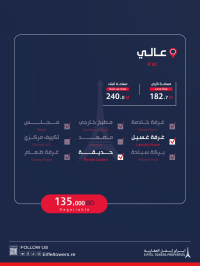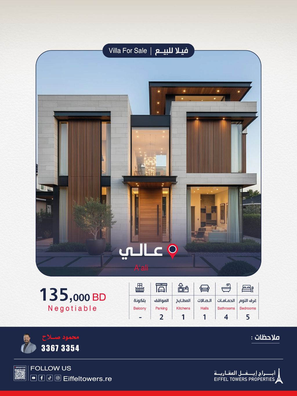 Eiffel Towers Real Estate Company offers a villa for sale in A'ali. Land area: 182.7 sqm. Built-up area: 240 sqm. Villa details: 2 floors, 5 rooms, 1 living room, 1 kitchen, 2 garages, 4 bathrooms. Additional features: laundry room, spacious courtyard. Total sale price: 135,000 Bahraini dinars. For contact: Mahmoud Salah, eiffeltowers.re, eiffeltowers.re, a licensed broker approved by the Real Estate Regulatory Authority, license number B202403/1257.
