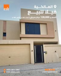 Location: Al-Malikiyah Street - Roundabout 12. A distinctive villa with a practical design suitable for a family, in a quiet location close to all services. Villa specifications: a garage that accommodates two cars, an open majlis connected to the living room, an internal kitchen + an external kitchen. First floor: 3 master bedrooms with bathrooms. Built-up area: 289 sqm. Land area: 186 sqm. Price: 128,000 Bahraini dinars, negotiable.