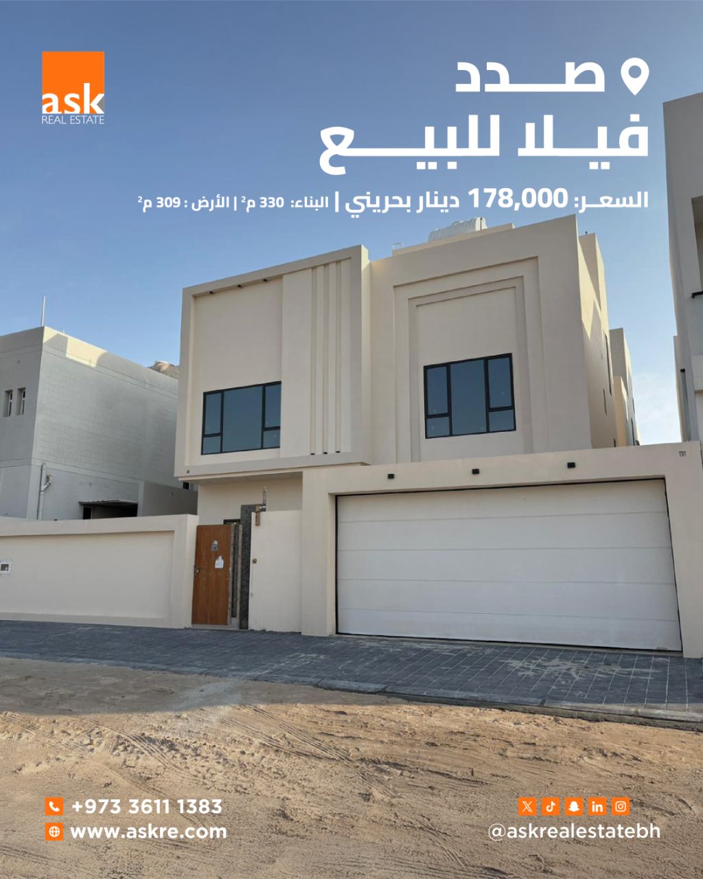 For sale: A luxurious villa in the Sadd area. Land area: 309 SQM. Built-up area: 330 SQM. Ground floor: One bedroom with a bathroom, a spacious living room, a bathroom, a kitchen, and a two-car garage. First floor: Three master bedrooms. Second floor: A maid's room with a bathroom, laundry area, preparation for a room on the first floor, and preparation for an elevator. Price: 178,000 BHD.
