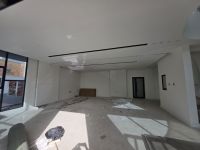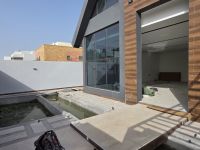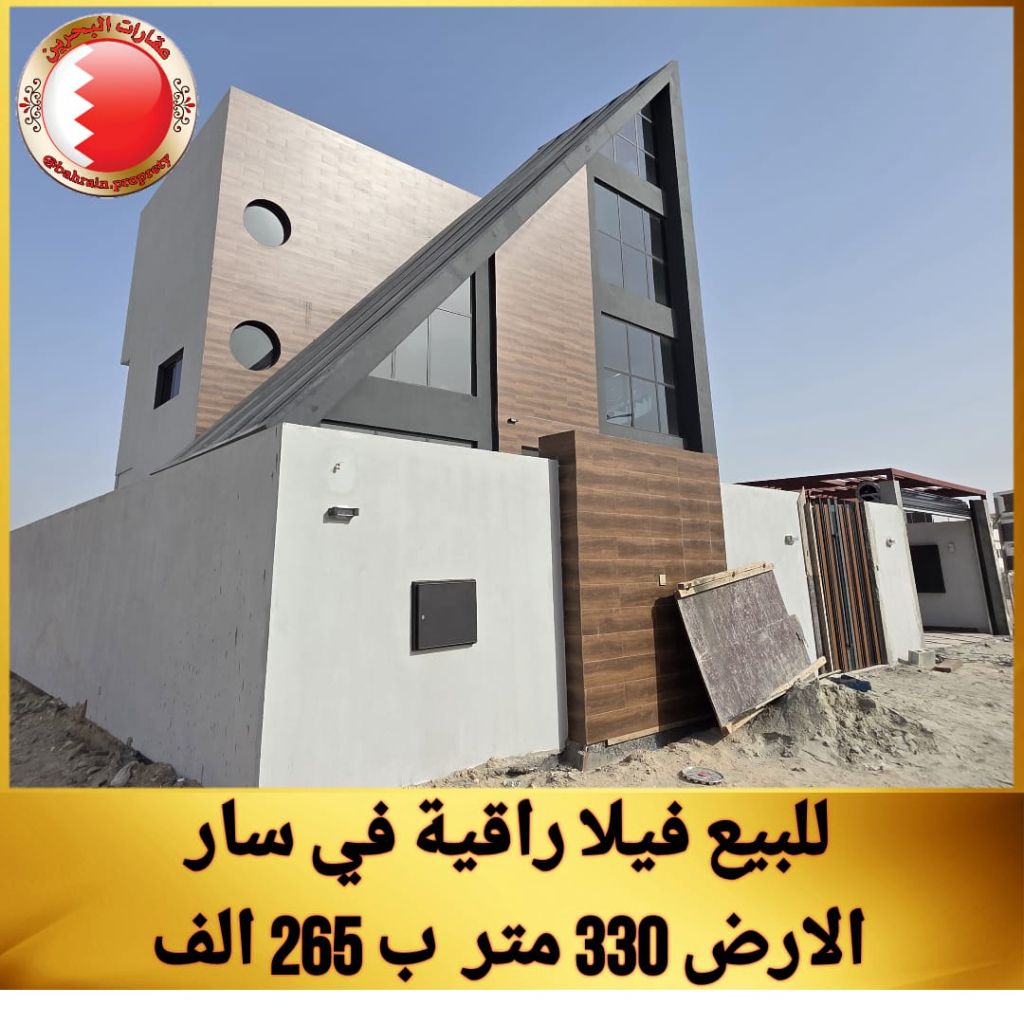 For sale: A new modern villa with an exceptional design (personal construction) in an upscale area in Sar (Al-Markh). It consists of three floors, two living rooms, a majlis, 5 master bedrooms, a spacious kitchen, a storage room, and a laundry room. High-end finishing. Central air conditioning. Garage for two cars. Swimming pool connected to a waterway around the villa. Built-up area: 451 square meters. Land area: 330 square meters. Price: 265 thousand dinars.