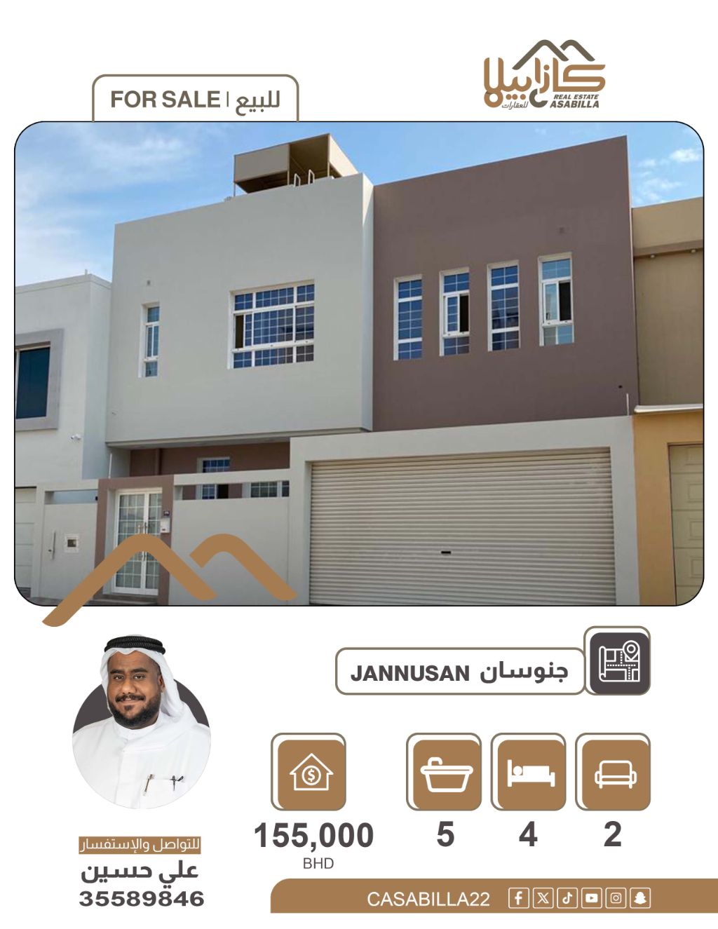 A new modern villa on two streets in Janusan, very close to the sea and with a private pool. Located on two streets in the Janusan / Jad Al-Haj area, a golden opportunity for those seeking social housing in an area very close to the sea. It consists of two floors with excellent construction and high-end finishing touches. Land area: 247.4 square meters. Building area: 297 square meters. The ground floor consists of a large hall, an open kitchen, a bathroom, a master bedroom with a bathroom, a garage for two cars, a front garden, and a backyard area.