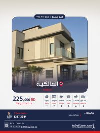 Eiffel Towers Real Estate Company offers a luxurious villa for sale in the Al-Malikiya area (close to essential services and facilities). The prime location is steps away from Al-Malikiya Club. It is near the girls' primary school. Minutes away from Karbabad Beach. Land area: 435 square meters. Built-up area: 400 square meters. Villa specifications: Ground floor features a large, elegantly designed open hall, a master bedroom, a dining room overlooking the hall, and a guest majlis.