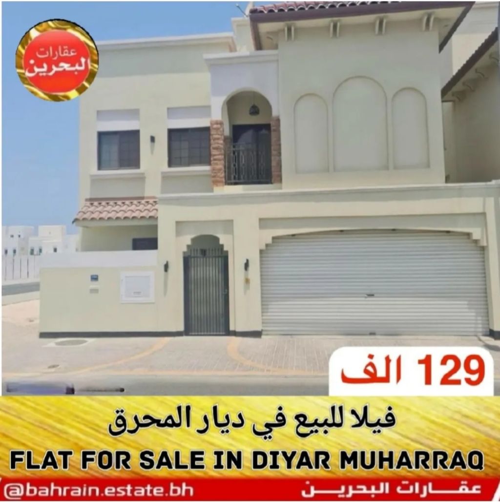 For sale: a corner villa in Diyar Al Muharraq - Dira Al Oyoun, on two streets with wide parking. Two floors, 4 bedrooms, 4 bathrooms, two living rooms, a majlis, an internal and external kitchen, a front and back yard, parking for two or more cars. Land area 204 square meters. Negotiable price 129,000 Bahraini dinars.