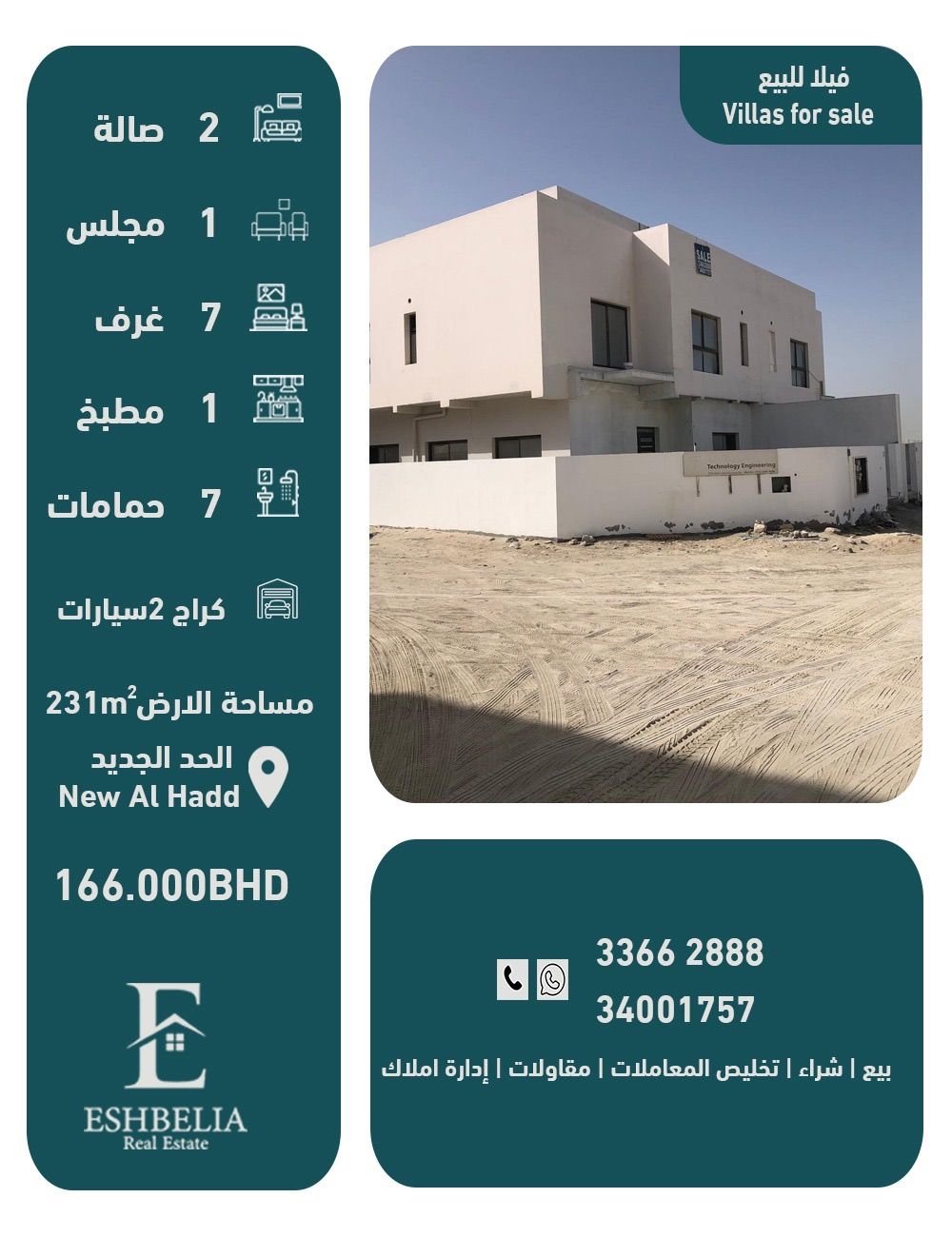 A once-in-a-lifetime opportunity not to be missed! We have two luxurious villas for sale with a distinctive new design, first occupancy, and a stunning sea view in the Al-Hadd Al-Jadeed area, close to services. They consist of: 2 large and spacious living rooms, 5 bedrooms, 1 majlis, 1 kitchen, 7 bathrooms, 1 maid's room, 1 laundry room, and a garage that fits 2 cars. Land area: 231 square meters. Sale price: 166,000 Bahraini dinars. For contact: Ishbiliya Office, Bouabdallah B201804 / 0125 license number. Ad number: 127.