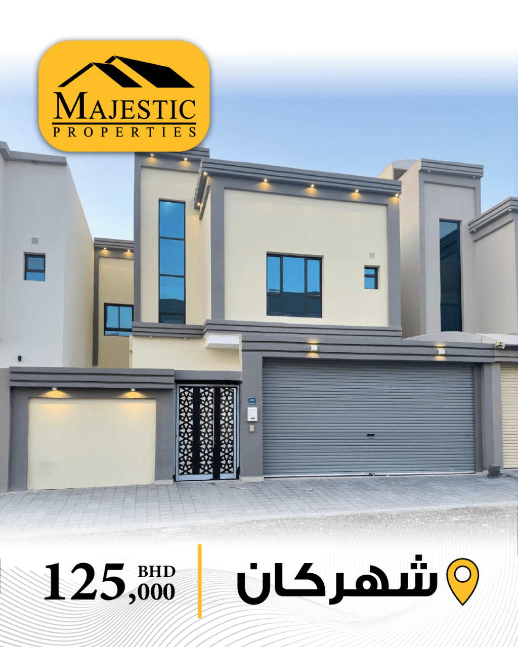 For sale, a new house in Shakhura consisting of 4 bedrooms, a living room, two kitchens, 5 bathrooms, a laundry room, a garage for two cars, land area 212 square meters, building area 265 square meters, asking price 125,000 Bahraini dinars, Ref MPM3160.