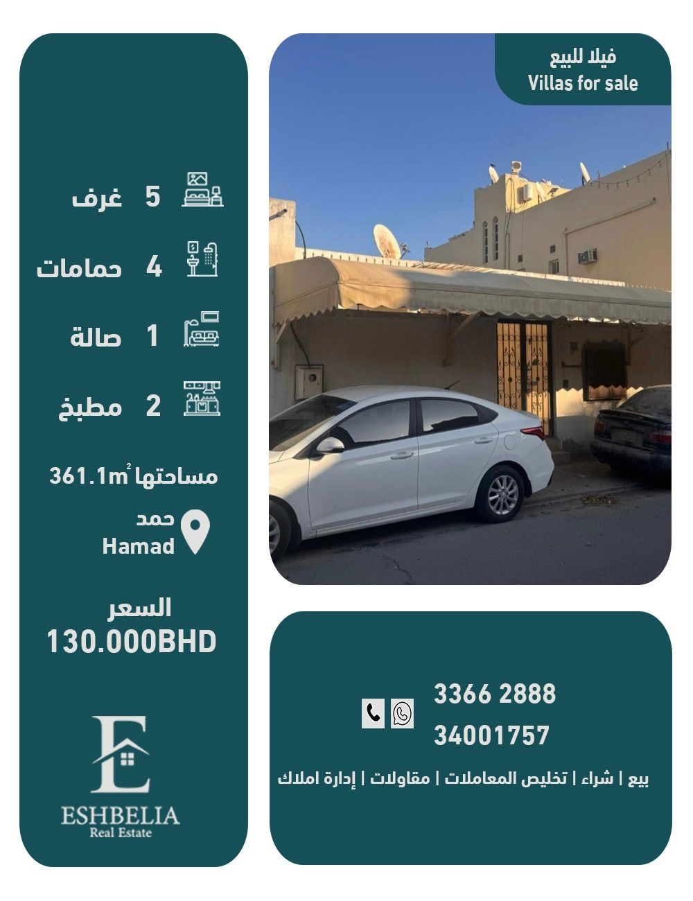 A distinctive villa for sale with elegant details in a beautiful area in Hamad City. It consists of 4 bedrooms, 4 bathrooms, 1 living room, 1 external kitchen, and 1 dining room. The villa area is 361.1 square meters. The requested price is 130 thousand dinars. License number B201804/0125. For contact: Ishbilia Bouabdullah office. Ad number 143.