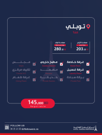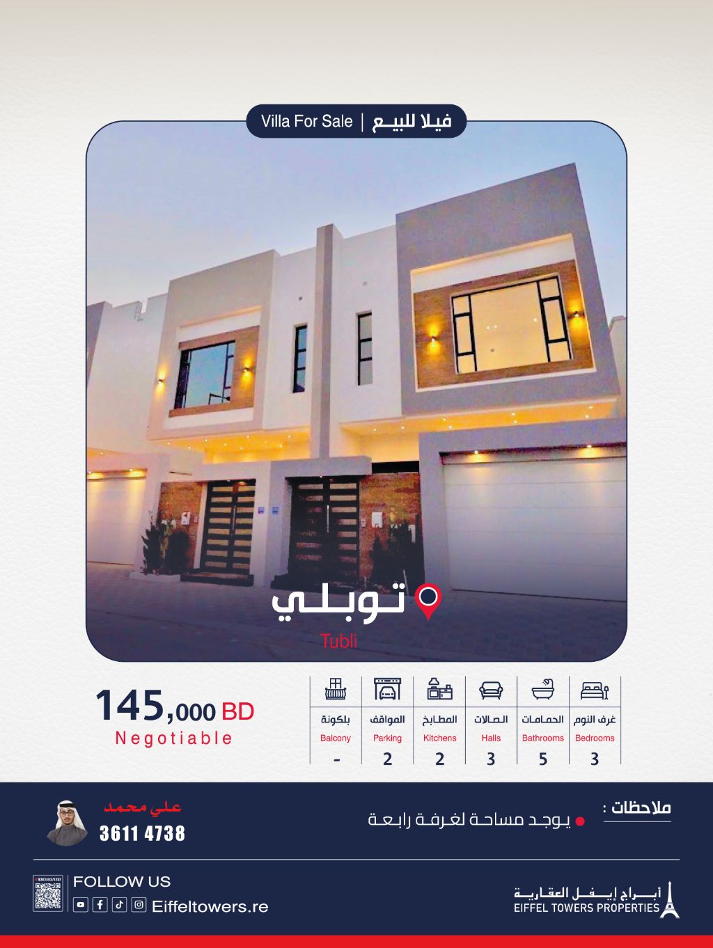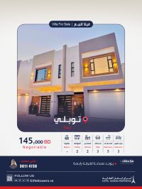 Eiffel Towers Real Estate Company offers a luxurious villa for sale in Tubli. The location is very prestigious, overlooking the walkway with beautiful sea views. Land area: 203 sqm, built-up area: 280 sqm. It features 3 bedrooms with a large master bedroom and dressing room (space for a fourth room), three open living halls, an internal kitchen, an external kitchen, a two-car garage, a laundry annex, and a domestic worker annex. Price: 145,000 BHD. For contact: Muhammad, eiffeltowers.re, a broker certified by the Real Estate Regulatory Authority, license number B202403/1257.