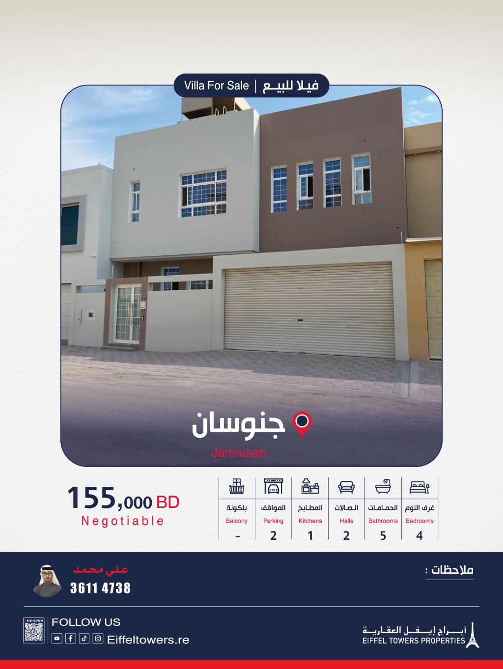 Eiffel Towers Real Estate Company offers a villa for sale in Janusan. Land area: 247.4 sqm. Building area: 297 sqm. Villa details: 4 bedrooms, 2 living rooms, 1 kitchen, 5 bathrooms, 2 parking spaces, maid's room with bathroom, front garden, swimming pool, located on two streets and a corner. Total price: 155,000 Bahraini dinars. For contact: Ali Mohammed. Eiffel Towers Real Estate is a certified broker by the Real Estate Regulatory Authority, license number B202403/1257.