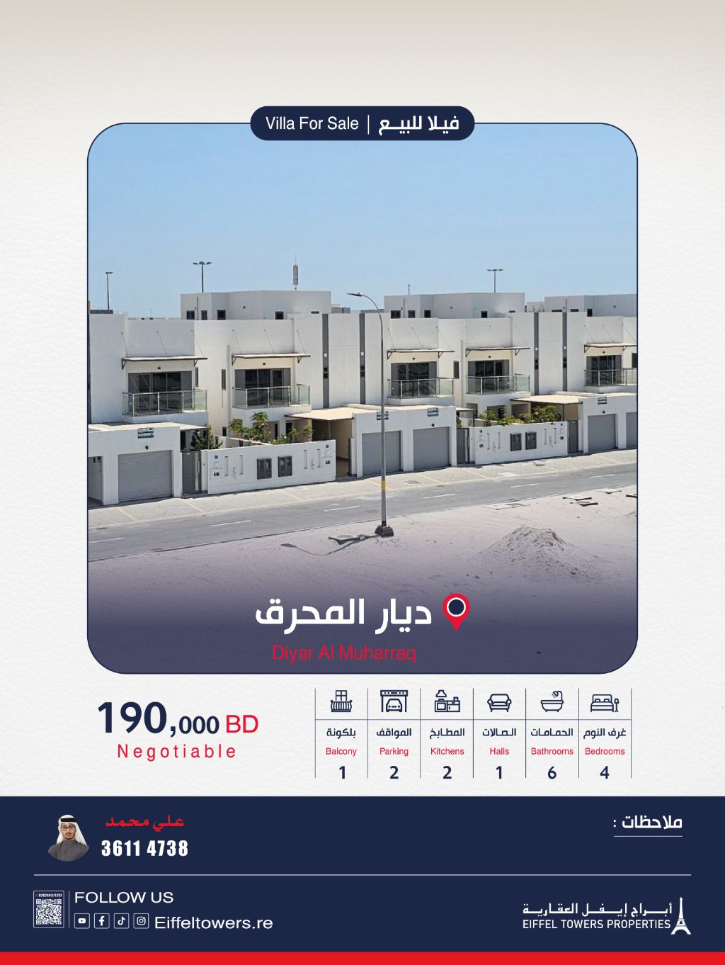 Eiffel Towers Real Estate Company for sale: A freehold villa in Diyar Al Muharraq, Al Thuraya. Land area: 315 square meters. Built-up area: 320 square meters. Semi-detached on one side. On two streets: front and rear. Villa specifications: A hall and dining room with a bathroom, 3 bedrooms, a guest room with an attached bathroom, a maid's room with an attached bathroom, 2 kitchens equipped with cabinets and built-in appliances, a storage room, a garden, and a swimming pool. Fully furnished. Sale price: 190,000 Bahraini dinars. For contact: