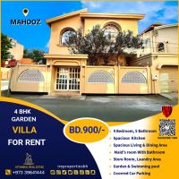 فيلا بحديقة 4 غرف نوم للإيجار في موقع متميز في المحوز - 900 دينار بحريني أبرز معالم العقار غرف النوم 4 غرف نوم واسعة مع اضاءة طبيعية وأفرة. الحمامات 5 حمامات مصممة بشكل جيد. غرفة المعيشة والطعام مناطق واسعة، مثالية للعائلات أو الضيوف المطبخ مطبخ عصري لتوفير الراحة. مخزن وغرفة غسيل غرفة للعاملة منزلية مع حمام ملحق. حمام سباحة ومنطقة حديقة - موقف سيارات 2 مواقف سيارات مغطاة. الموقع موقع