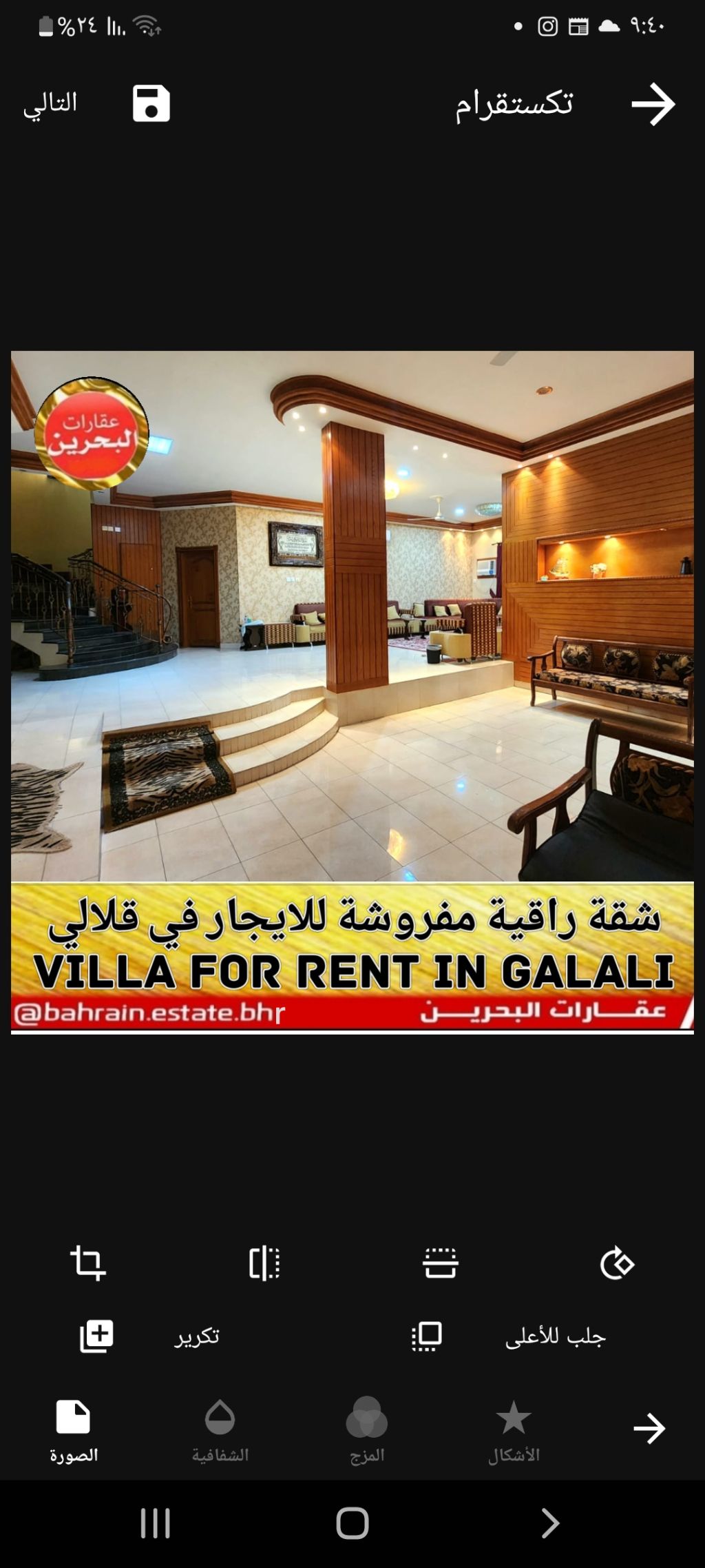 فيلا للإيجار. فيلا أنيقة ومفروشة بالكامل في قلالي. المميزات: مساحة معيشة واسعة، 3 صالات، مجلس، 6 غرف نوم، مطبخان كبيران، 7 حمامات، شرفة، موقف سيارات يتسع لـ 6 سيارات، مسبح خاص، وغيرها. الإيجار: 820 دينار بحريني (يشمل الكهرباء). للتواصل.