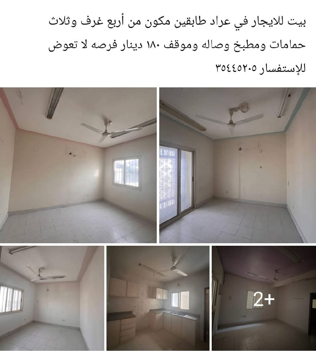 بيت للإيجار في عراد، طابقين، مكون من أربع غرف وثلاث حمامات ومطبخ وصالة وموقف سيارات بسعر 180 دينار. فرصة لا تعوض