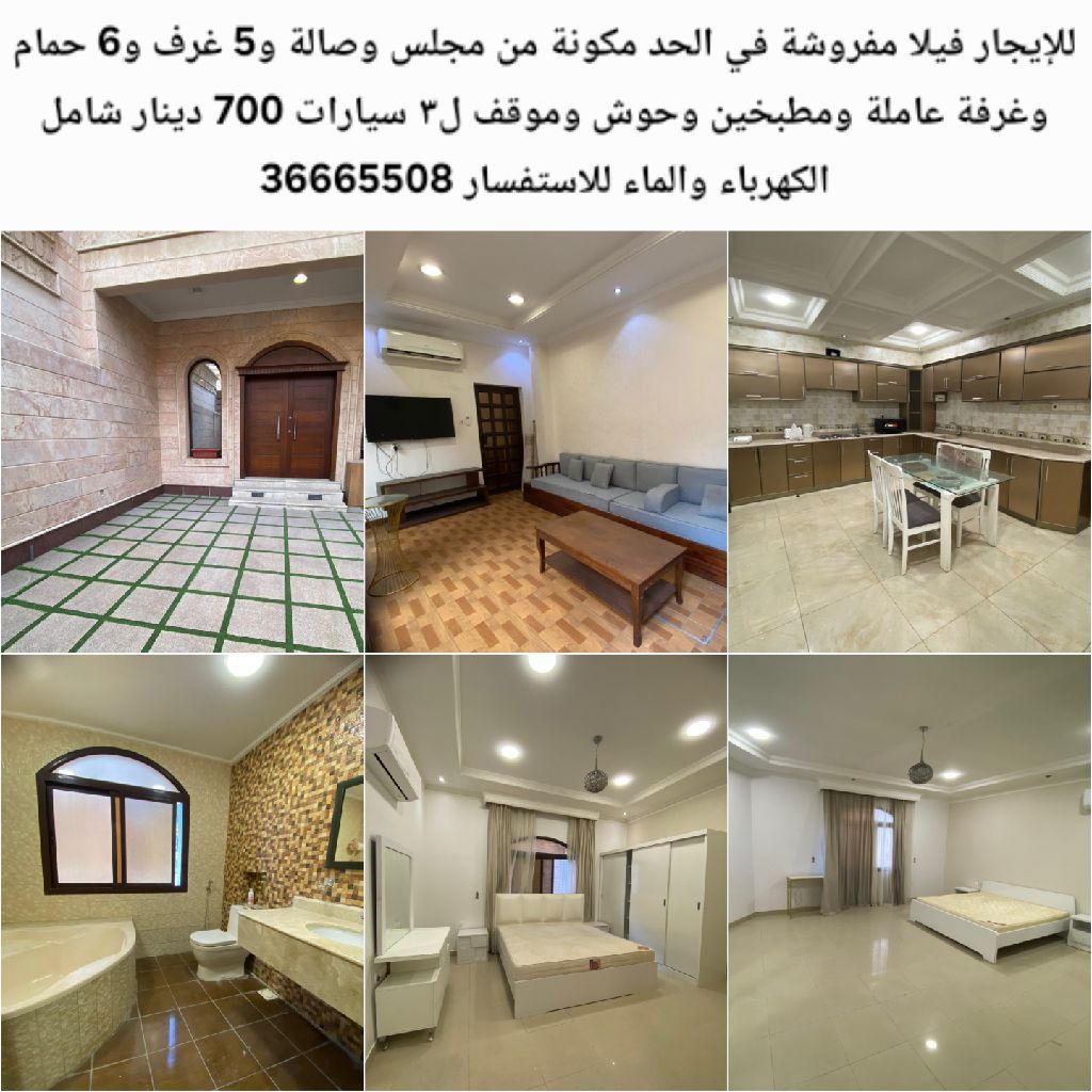 للإيجار فيلا مفروشة في الحد مكونة من مجلس وصالة و5 غرف و6 حمام وغرفة عاملة ومطبخين وحوش وموقف ل 3 سيارات. 700 دينار شامل الكهرباء والماء