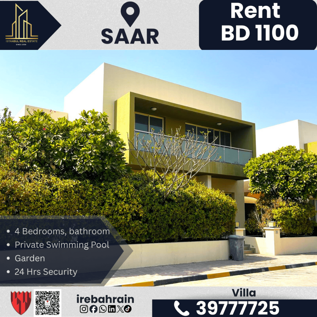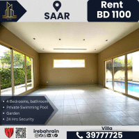 فيلا شبه مفروشة مع مسبح خاص للإيجار - الإيجار 1100 دينار بحريني شهرياً (بدون كهرباء ومياه). الموقع: سار - منطقة سكنية راقية. المميزات: غرفة معيشة واسعة، مطبخ مغلق، 4 غرف نوم، 4 حمامات، غرفة ملابس، غرفة للعاملة المنزلية، مخزن، مسبح خاص، حديقة، منطقة ألعاب للأطفال، موقف سيارات، أمن وصيانة على مدار الساعة. سهولة الوصول إلى العلى السرة، طريق البديع السريع، ومدرسة سانت كريستوفر البريطانية. جميع الخدمات المحلية متاحة. للتواصل.