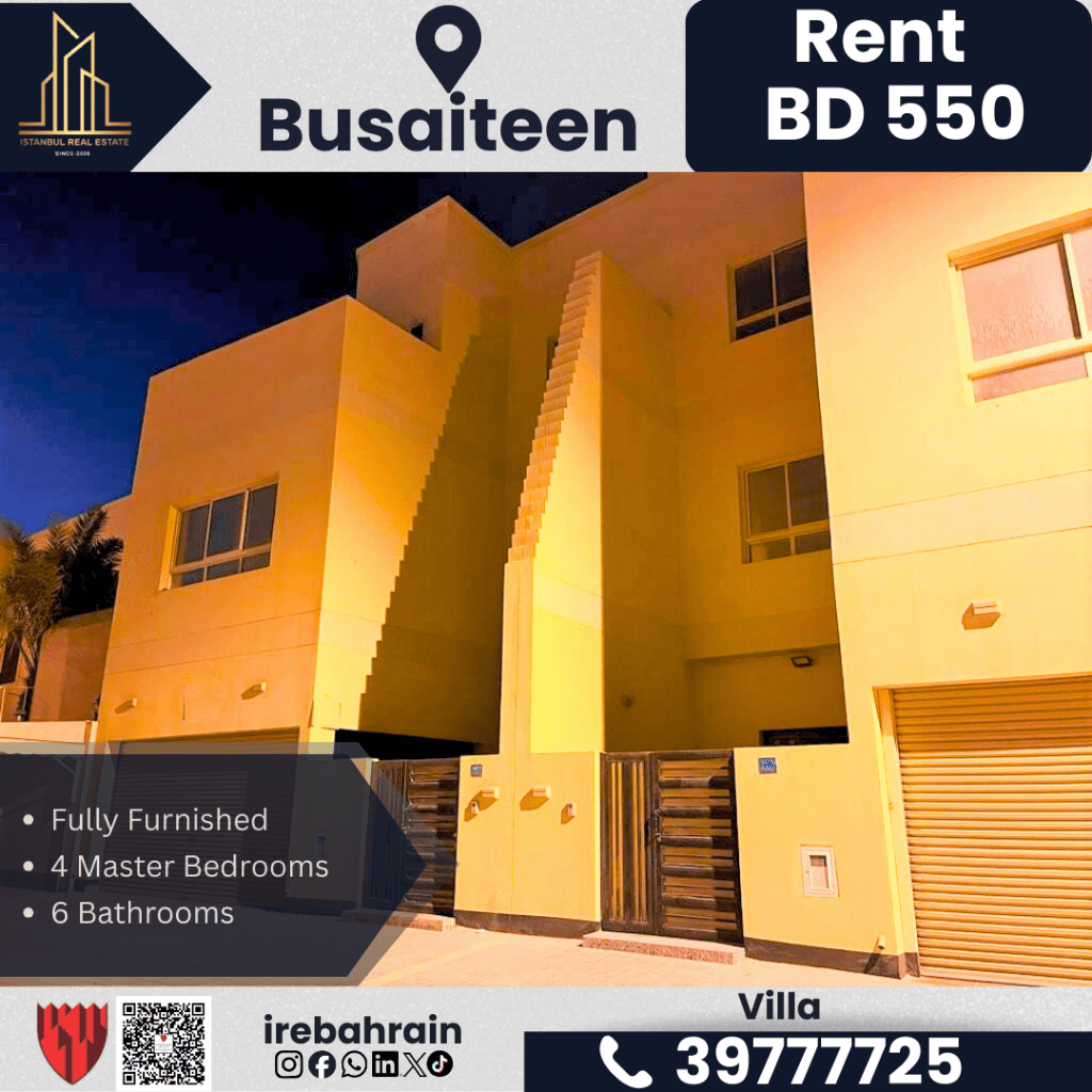 فيلا فاخرة مفروشة بالكامل للإيجار في البسيتين بسعر 550 دينار بحريني. الموقع: البسيتين. النوع: فيلا فاخرة مفروشة بالكامل تحتوي على 4 غرف نوم رئيسية مع خزائن ملابس وشرفات، 6 حمامات، غرفة معيشة، غرفة طعام، مطبخ مجهز بالكامل، غرفة للعاملة المنزلية، منطقة غسيل الملابس، موقف سيارات مغطى، أثاث عالي الجودة. سهولة الوصول إلى كورنيش السيح، مستشفى الملك حمد، المطار، والمنامة. الإيجار: 550 دينار بحريني شهرياً (بدون كهرباء ومياه). للتواصل.