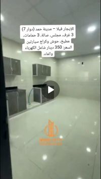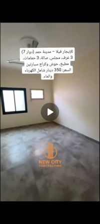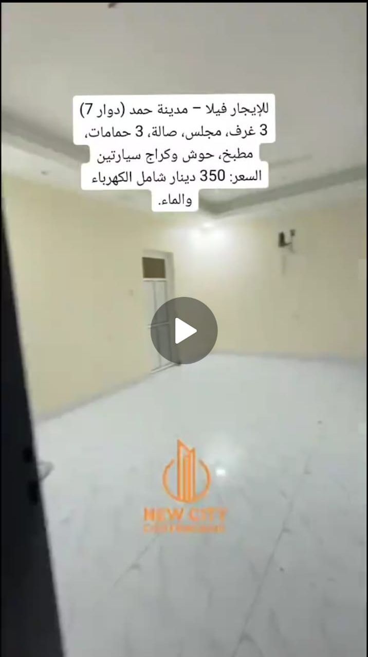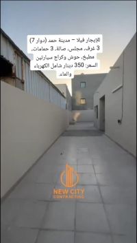 للإيجار: بيت واسع شامل الكهرباء في مدينة حمد، دوار 7. يتكون من 3 غرف نوم، 3 حمامات، صالة، حوش واسع، كراج، ومطبخ كبير. الإيجار 350 دينار شامل الكهرباء. تلفون.