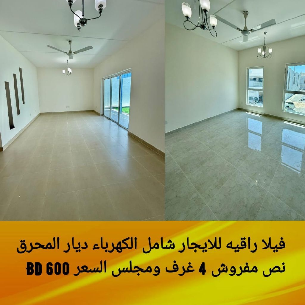 فيلا راقية للإيجار شامل الكهرباء نصف مفروش في ديار المحرق تتكون من 4 غرف نوم 1 مجلس 2 صالات 4 حمامات 1 مطبخ 1 بلكونه 1 حديقة خلفية 2 كراج سيارتين السعر 600 دينار مع الكهرباء والماء للتواصل