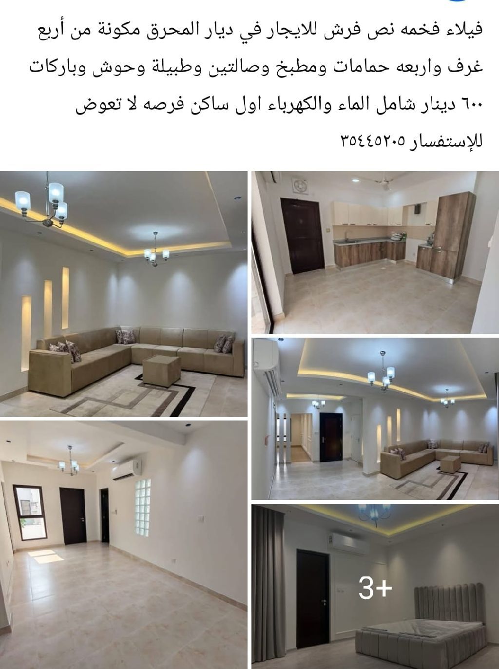 فيلا فخمة نصف فرش للإيجار في ديار المحرق، مكونة من أربع غرف نوم وأربعة حمامات ومطبخ وصالتين وغرفة خادمة وحوش وبركة سباحة. 600 دينار شامل الماء والكهرباء. أول ساكن، فرصة لا تعوض