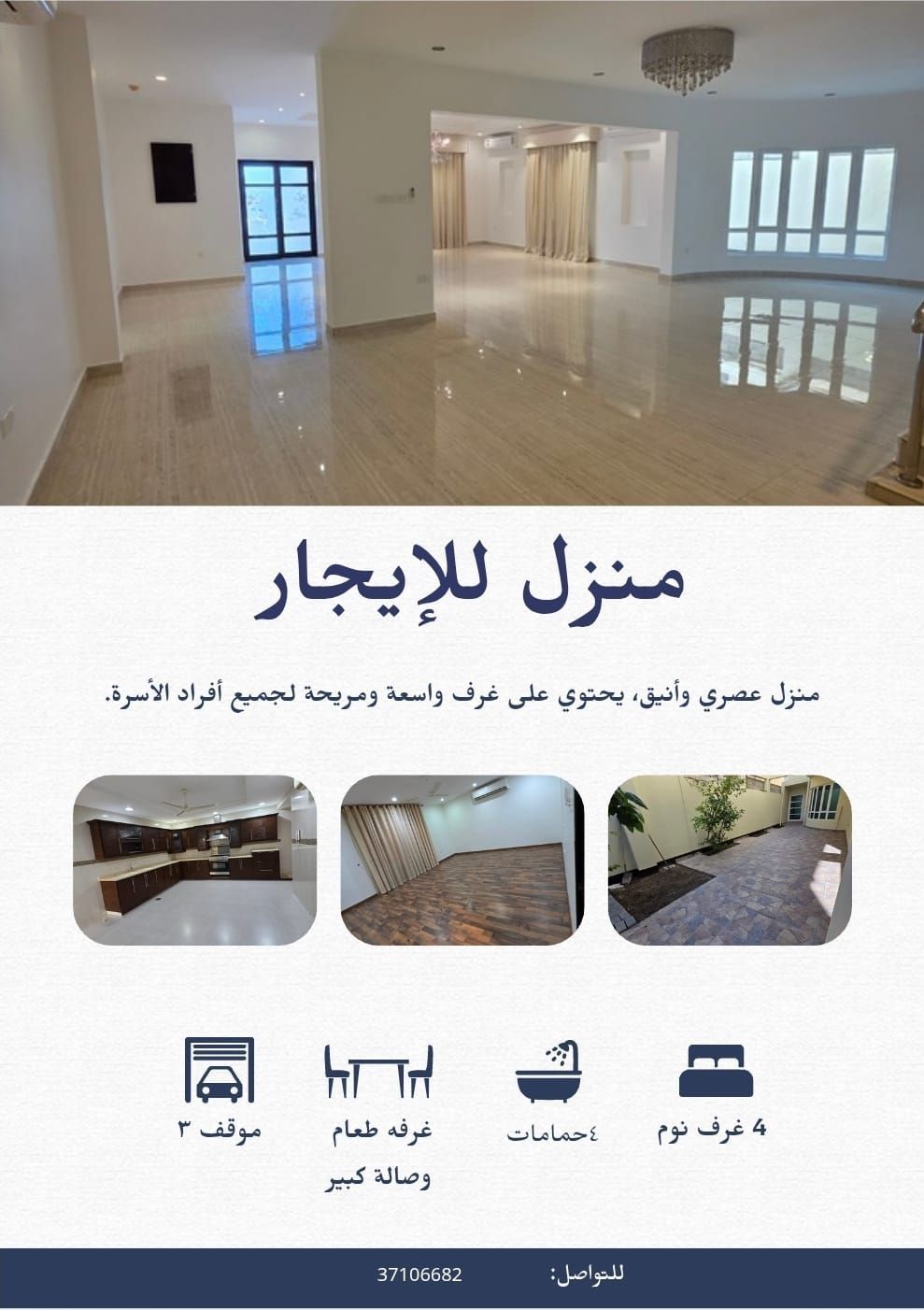 بيت للإيجار في قلالي. المواصفات: حديقة على جانبين. 4 غرف كبيرة. 4 حمامات. صالة كبيرة ومجلس كبير مفتوحين على بعض. مطبخ كبير مع ملحق للغسالة والنشافة. مغسلتين منفصلين للمجلس والصالة. مخزن صغير. غرفة خادمة مجهزة بمكيفات سبليت وجميعها بحالة ممتازة وجديدة. مواقف سيارات تسع إلى 2-3 سيارات أمام البيت. المطلوب: 400 دينار. للتواصل.
