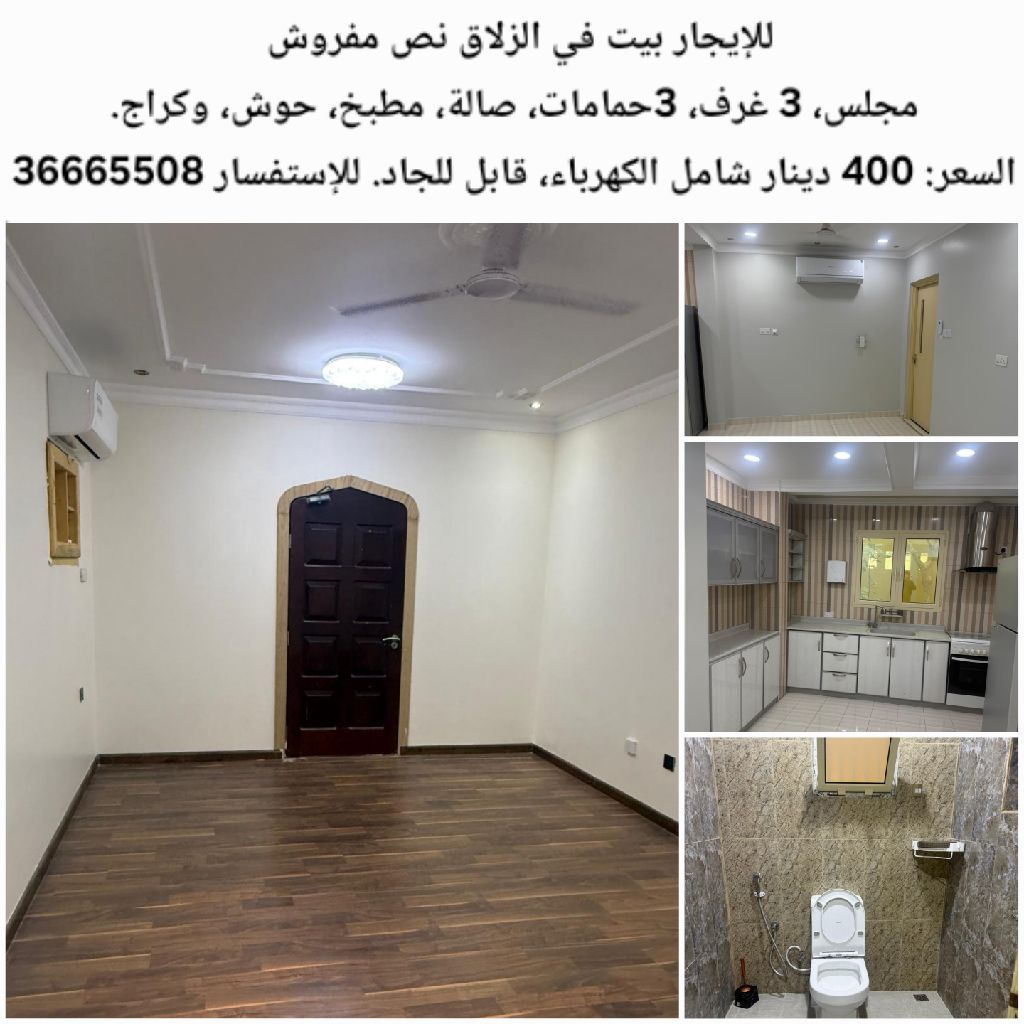 للإيجار: بيت في الزلاق، نصف مفروش، مجلس، 3 غرف، 3 حمامات، صالة، مطبخ، حوش، وكراج. السعر 400 دينار شامل الكهرباء، قابل للجاد.