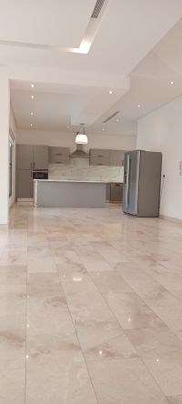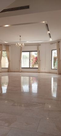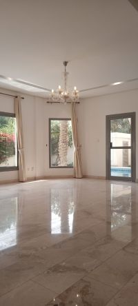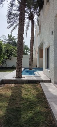 For rent, a luxurious villa in SAR - near King Fahd Causeway. The first floor has 4 master bedrooms with a sitting area and balcony. The ground floor includes a reception hall, spacious living room, elegant dining room, wide hall with a view of the pool, modern open kitchen with an external door. Facilities include a laundry room, maid's room with bathroom, storage room, garage for two cars, private