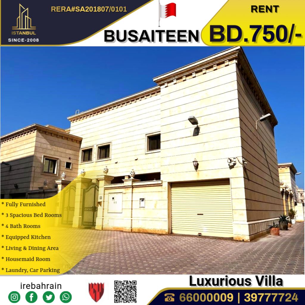 A luxurious fully furnished villa for rent in Al Bussayteen - 750 Bahraini Dinars per month. Enjoy a high - class living experience in a prime location. Al Bussayteen, Bahrain. rent 750 Bahraini Dinars per month. 3 bedrooms, 4 bathrooms, car garage, pets allowed. Features of The Villa fully furnished with luxurious and elegant furniture, spacious living and dining area, modern equipped kitchen
