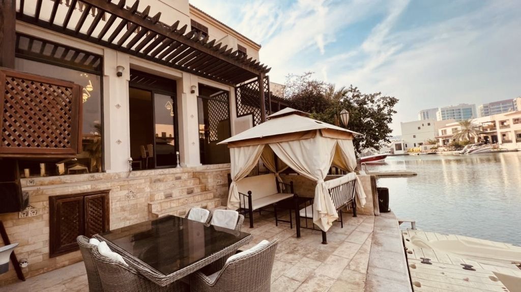 Villa for rent in Amwaj Islands, Floating City, directly on the lake. It has 4 master bedrooms, 5 bathrooms, a kitchen, a large living room, and a large terrace overlooking the lake. fully furnished. The required rent is 1000 dinars excluding electricity and water, or 1200 dinars including electricity, water, and municipality fees. For contact