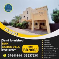 A semi furnished villa with a garden, 5 bedrooms for rent in Janabiyah for 900 Bahraini dinars. This villa in a compound consists of 5 bedrooms, 5 bathrooms, a spacious living room, a dining area, fully equipped and large kitchen, a maid's room with a bathroom, a laundry area, garden, a covered parking for two cars, a swimming pool, a gym, and more. easy access to Mercado Mall, Othaim Mall, Saar