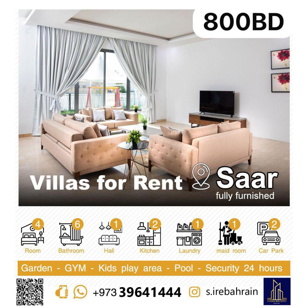 Fully furnished High Luxury Garden Villa for rent in Saar BD800. This Furnished Luxury Garden Villa is located in Saar near Saar Mall, consists of 4 bedrooms, 6 bathrooms, spacious living & dining area, 2 modern kitchens, maid room with bathroom, laundry room, garden area, swimming pool, gym, kids play area, 2 covered car parking, 24 hours security. easy access to Saar Mall, Jenabiya, Atrium Mall