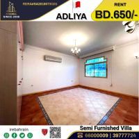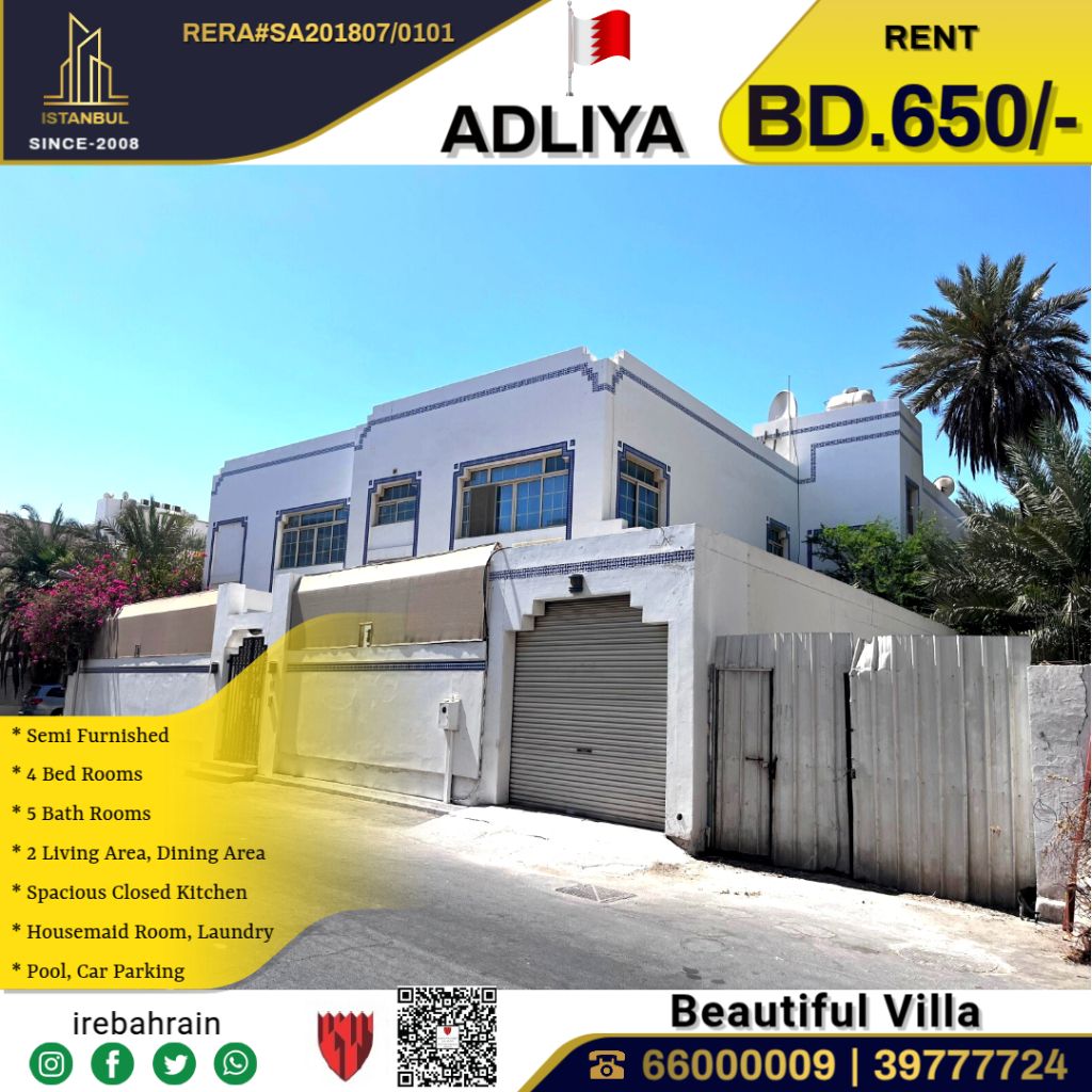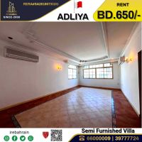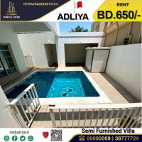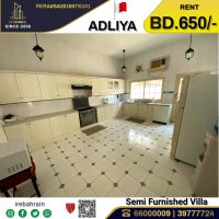 A semi furnished villa for rent in Adliya, priced at 650 Bahraini dinars. This beautiful villa is located in Adliya, distinguished residential area. It consists of 4 bedrooms, 5 bathrooms, 2 living rooms, a spacious fully equipped kitchen, a storage room, a laundry room, a maid's room, and more. The Villa is air - conditioned, has wardrobes, a swimming pool, a parking space, and easy access to HSBC