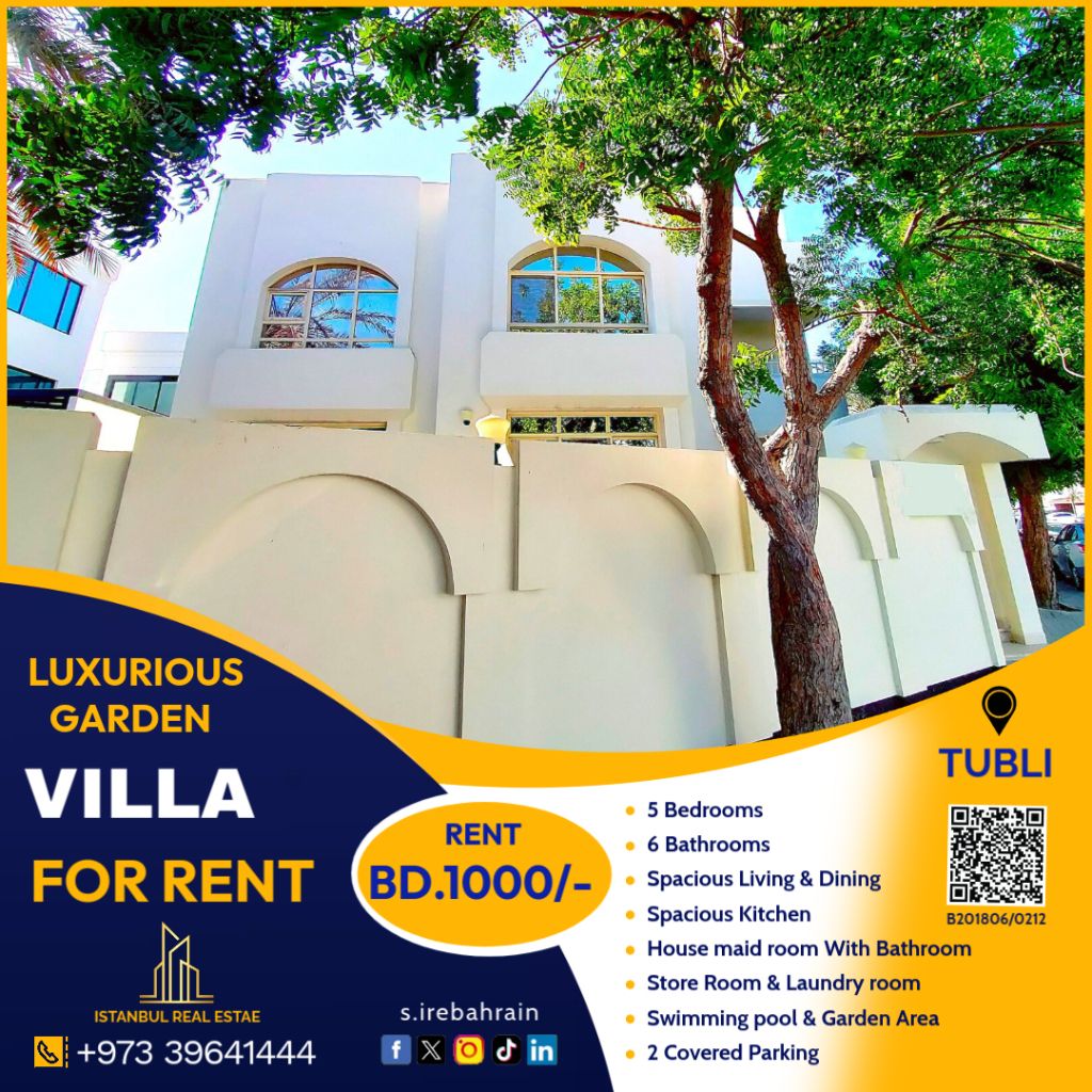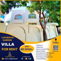 A luxurious semi furnished villa with 5 bedrooms and a garden is available for rent in Tubli for 1000 Bahraini Dinars. This independent semi furnished villa is located in Tubli near the Highway and consists of 5 bedrooms, 6 bathrooms, a modern kitchen, spacious living and dining rooms, a laundry area, storage room, a balcony, a large garden area, swimming pool, and a covered parking space. It offers