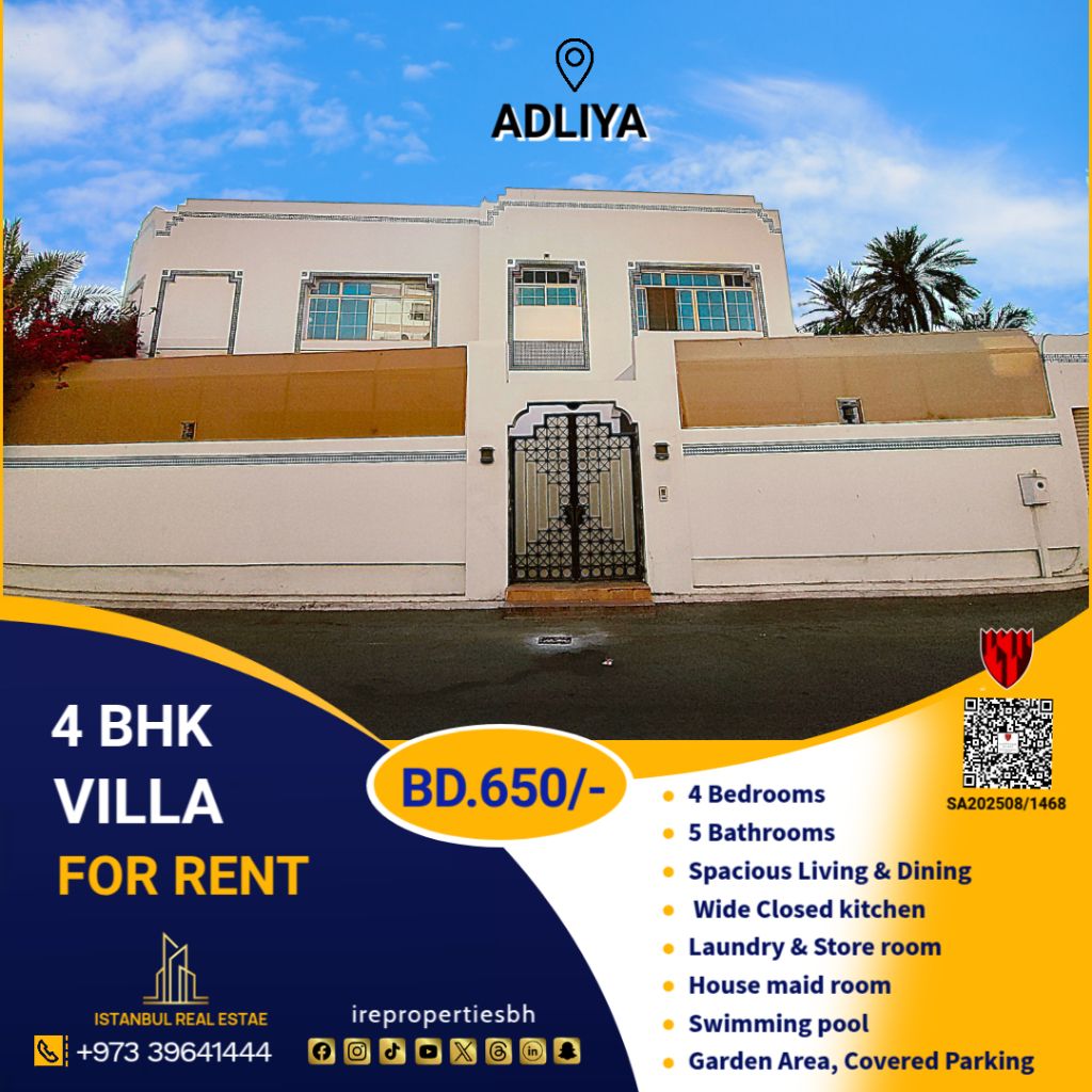 A semi-furnished villa for rent in Al Adliya, with 4 bedrooms for 650 Bahraini dinars. The beautiful villa is available for rent in a prime location in Al Adliya. It includes 4 beautiful bedrooms, 5 bathrooms, a spacious living room, a dining area, a large closed kitchen, a maid's room, a storage room, a laundry room, a swimming pool, a garden area, and a covered parking space. The rent is 650 Bahraini dinars, inclusive of electricity and water.