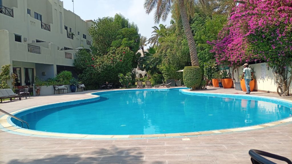 Villa for rent in the Adliya area. Price: 1100 dinars. Area: Not specified. Specifications: Semi-furnished for discerning tastes, consisting of 4 rooms, 5 bathrooms, a maid's room, a gym, a swimming pool, and a car park. Location: Prime, close to services, ready finishing. For contact.