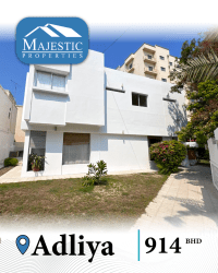 For rent, a fully furnished villa in Al Adliya consisting of 3 bedrooms, a living room, a kitchen, a dining room, 3 bathrooms, a garden, a swimming pool, and a garage for two cars. The rental price is 914 Bahraini dinars. Ref HH127