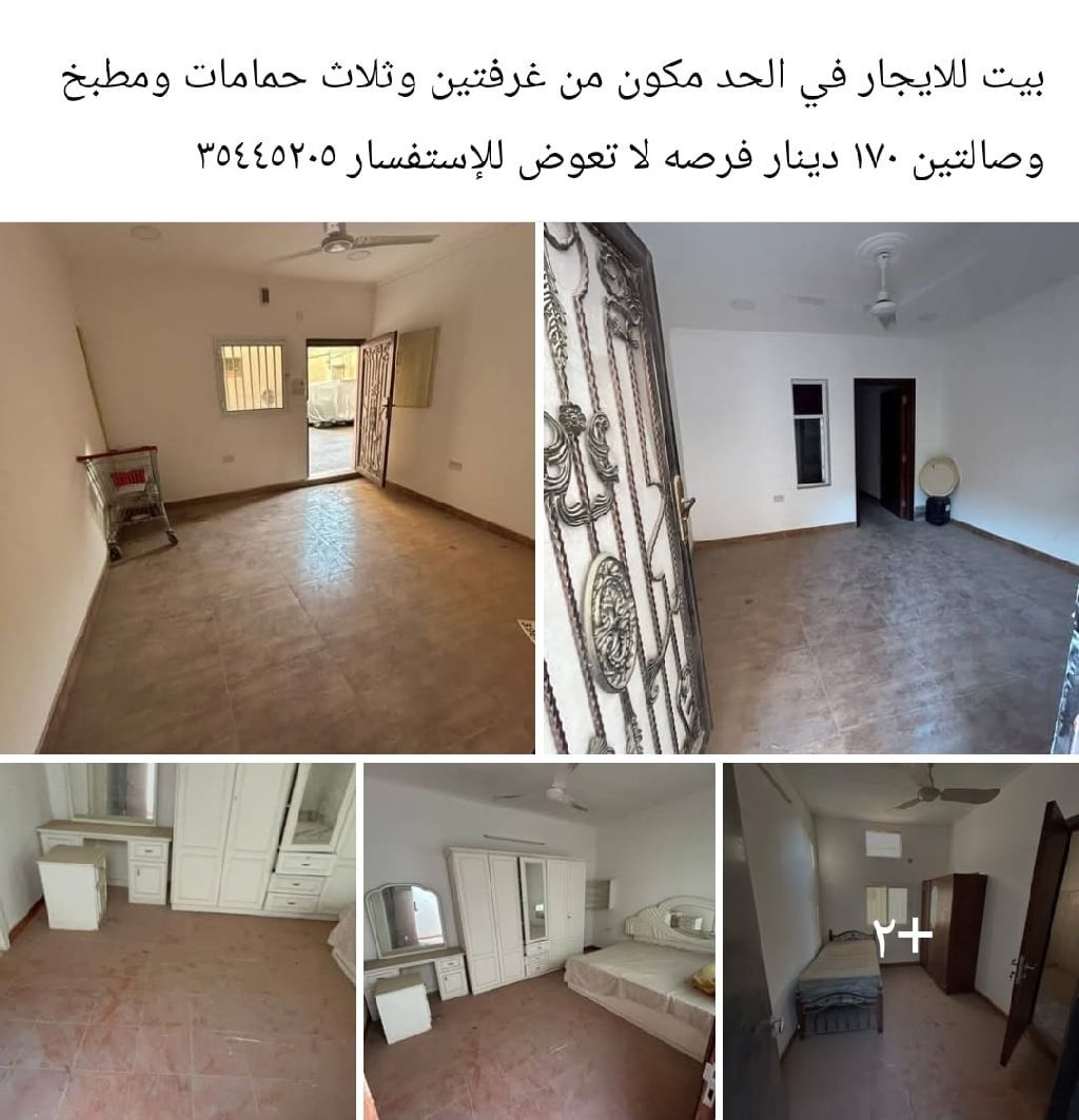 A house for rent in Al-Hadd, consisting of two rooms, three bathrooms, a kitchen, and two halls, for 170 dinars. An opportunity not to be missed.