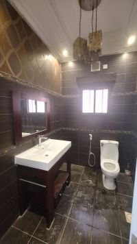 For rent: half a house in Sanad, including electricity and air conditioners. It consists of three rooms, a hall, a kitchen, and three bathrooms. Price is only 350.