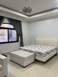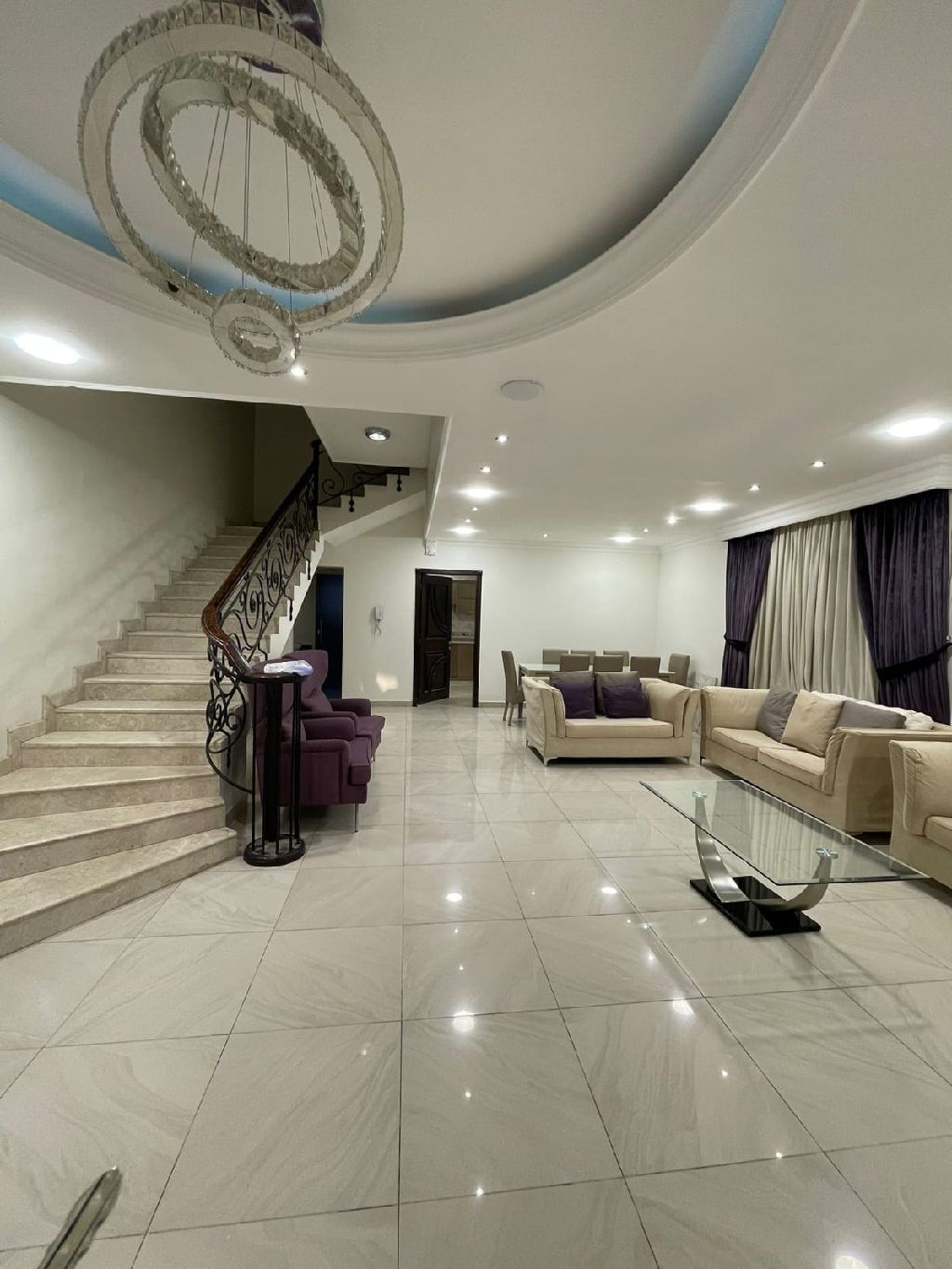 For rent: A villa in Al Hidd, including electricity, without furniture. It has 5 bedrooms, 5 bathrooms, two kitchens, a large living room, a majlis, a maid's room, and a garage for two cars, at a price of 800 Bahraini dinars. For contact: Al Burj Al Jadeed Real Estate.