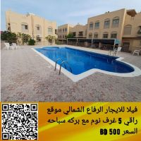 Villa for rent in Northern Riffa, excellent location, semi-furnished, with air conditioning and curtains. It consists of 5 bedrooms, 5 bathrooms, a spacious living room, 2 kitchens (internal and external), a maid's room with its own bathroom, a shared swimming pool, and a children's play area. Price is 500 dinars, excluding electricity. For inquiries and contact.