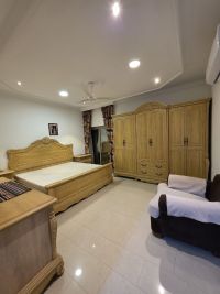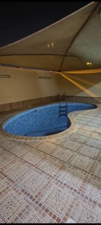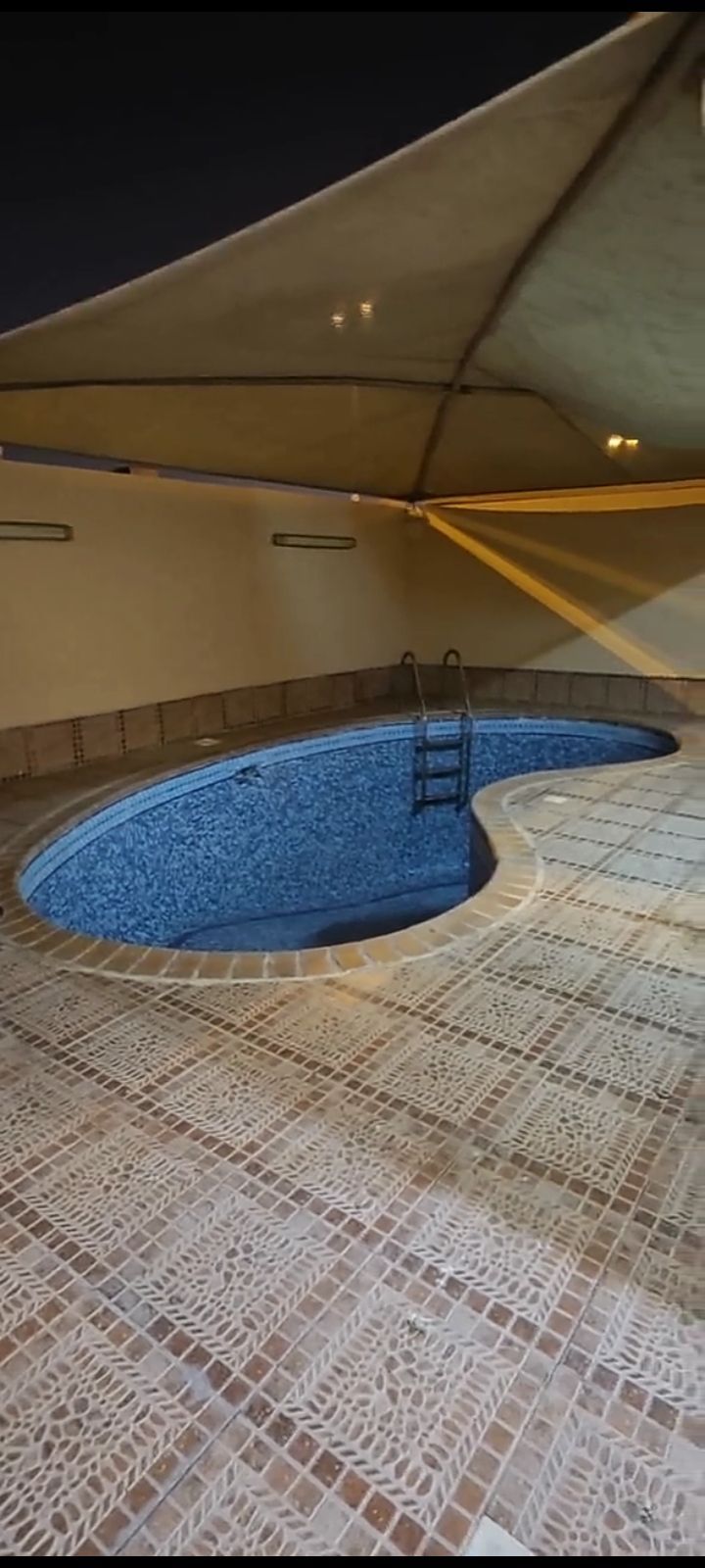 Luxury villa for rent in Al-Hidd, semi-furnished, consisting of four rooms, four bathrooms, a hall, a kitchen, a private pool, a maid's room, and a courtyard for 450 dinars.