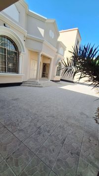 For rent, a house in the Sanad area near the Isa Town Health Center on the main street. The house is one floor and contains three bedrooms: a master bedroom with an en-suite bathroom and two additional bedrooms. It has three bathrooms, an internal kitchen, a spacious living room, and external facilities including an external kitchen, a maid's room with a bathroom, and a garage for two cars. The house is equipped with air conditioners, a refrigerator, an oven, and a water cooler. The price is 470 dinars, excluding utilities.