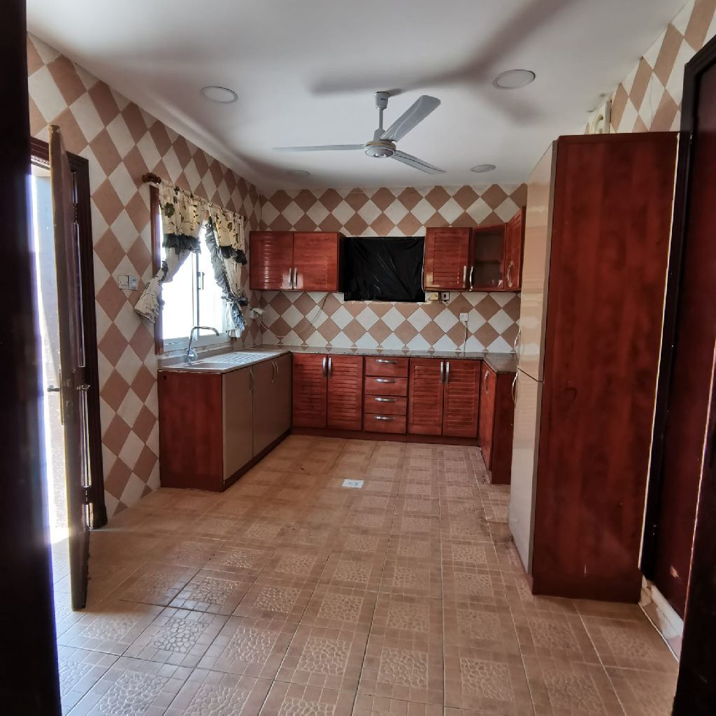 A house for rent in Hamad City, First Roundabout, consisting of 6 bedrooms, 2 bathrooms, a kitchen, 2 car garages, and a private annex (small room, bathroom, kitchen, yard) for a domestic worker or driver. The requested price is 400 including electricity and water, or 350 excluding electricity. For contact.