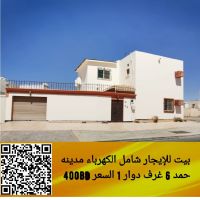 A house for rent, including electricity, in Hamad City, First Roundabout. It has 6 bedrooms, 2 bathrooms, a kitchen, and 2 car garages. Includes a private annex (small room, bathroom, kitchen, courtyard). Suitable for a domestic worker or driver. 400 BHD including electricity and water, 350 BHD excluding electricity. For contact.