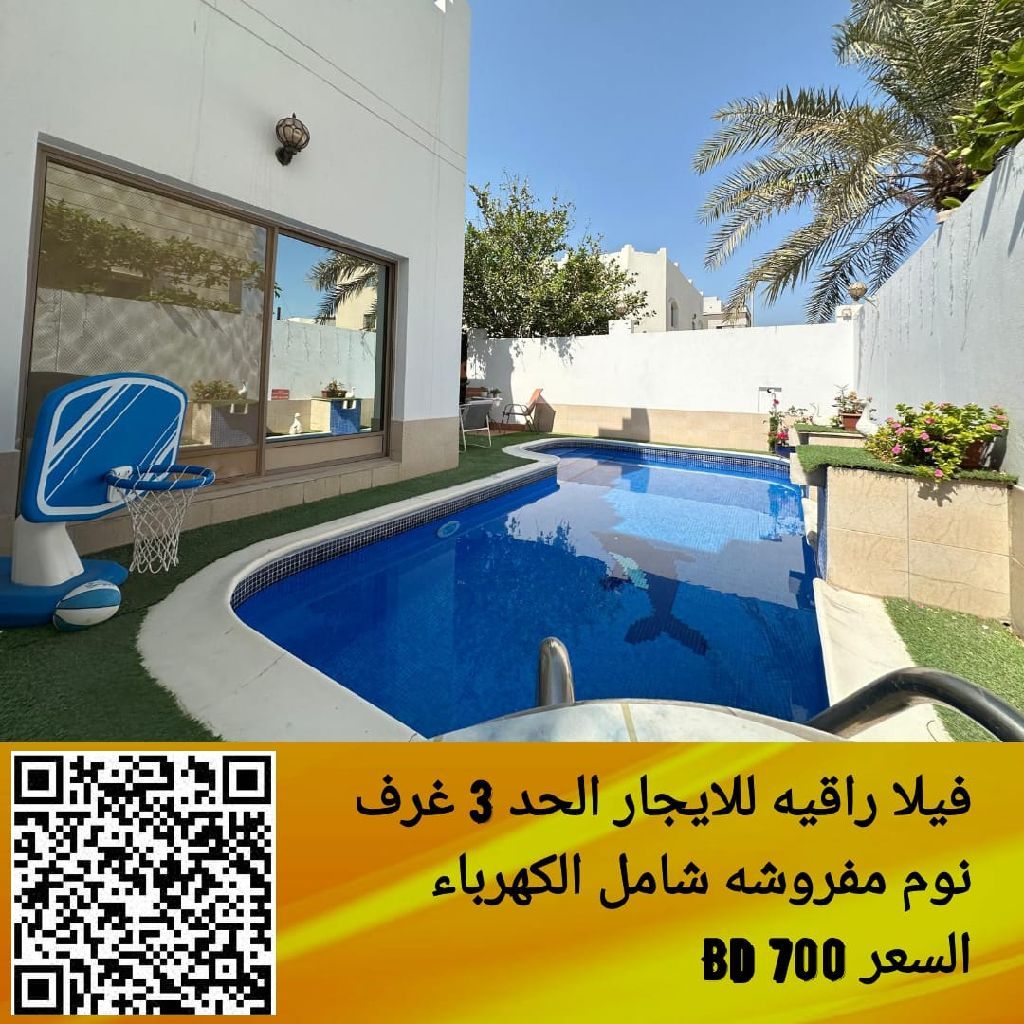 A luxurious villa for rent, fully furnished with elegant furniture, including electricity. Located in a prime area with a private swimming pool. It consists of 3 bedrooms, 3 bathrooms, a large living room overlooking the pool, and 2 parking spaces. Price is 700, including electricity, and is negotiable. For contact.