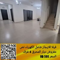 For rent: A villa with electricity included, semi-furnished, in Diyar Al Muharraq. It consists of a separate majlis with a bathroom, 4 bedrooms (two of them master bedrooms), 4 bathrooms, 1 kitchen, 2 living rooms, 1 garage for two cars, external parking, a backyard garden, a store, and a laundry room. The price is 500, including electricity, water, air conditioning, and curtains. For contact.