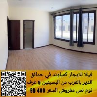 A villa for rent at an attractive price in Hadaeq Al Deir, near Al Bseisin, opposite the airport, on Riya Street in a compound. It consists of 5 master bedrooms, 6 bathrooms, 2 kitchens (internal and external), and a garage for 2 cars. The price is 400 Bahraini dinars. For contact.