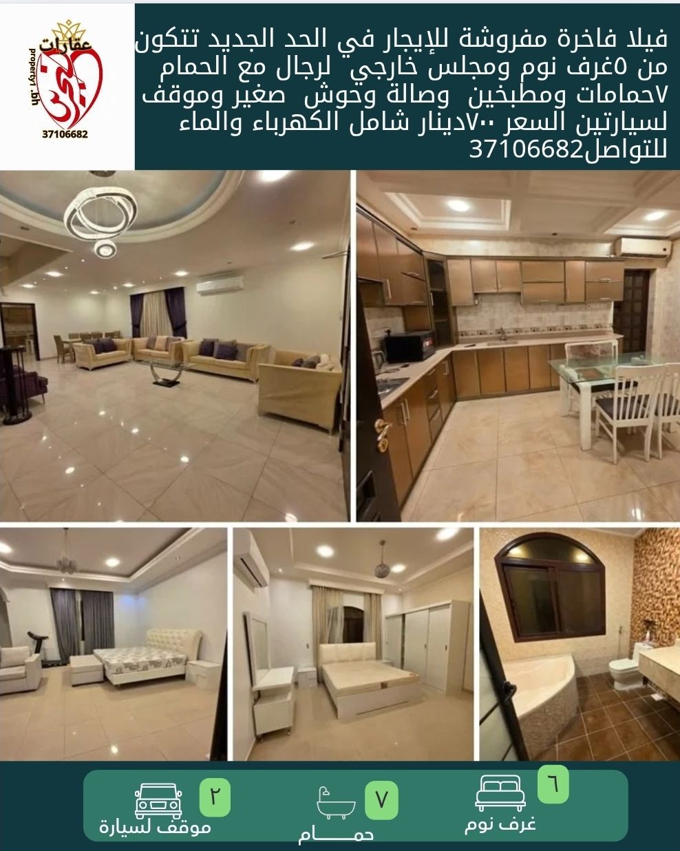 A luxurious furnished villa with a modern design for rent in Al-Hadd Al-Jadeed. It consists of 5 bedrooms, an external men's majlis with a bathroom, 7 bathrooms, 2 kitchens, a living room, a small courtyard, and parking for 2 cars. The price is 700 dinars including electricity and water. For contact.