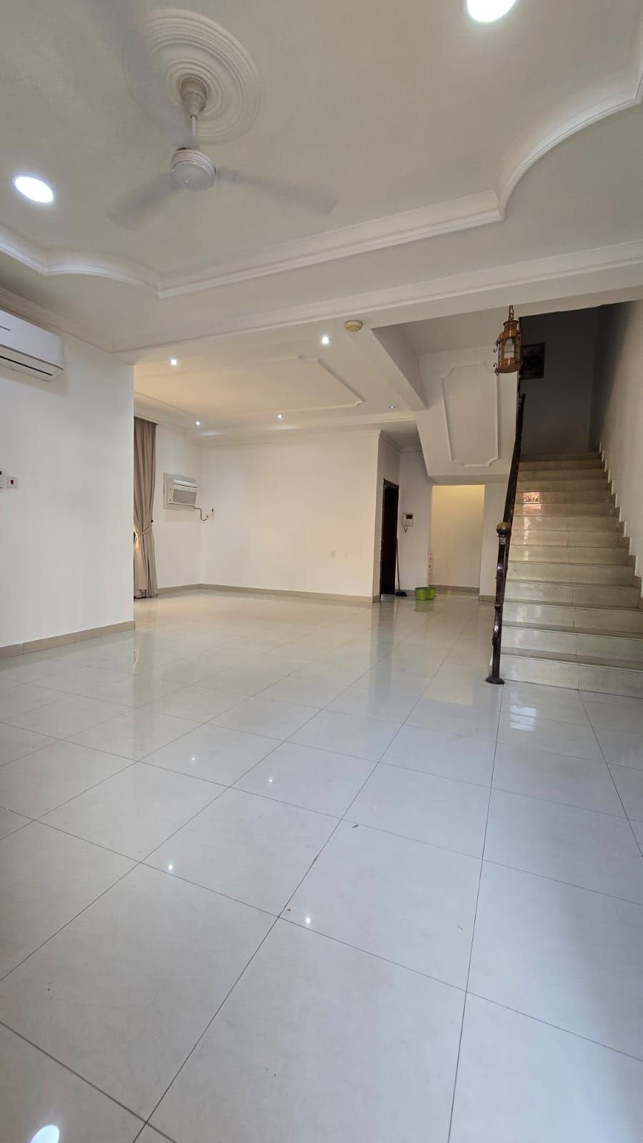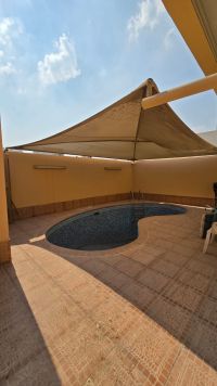 For rent, a villa in Al Hidd with air conditioning, consisting of 3 bedrooms, 5 bathrooms, a living room, a kitchen, a swimming pool, and a garage. The rental price is 450 dinars. For contact, Al Ain Bahrain Real Estate Center (a licensed sales agent by the Real Estate Regulatory Authority), license number (SA201803 / 0013), telephone.